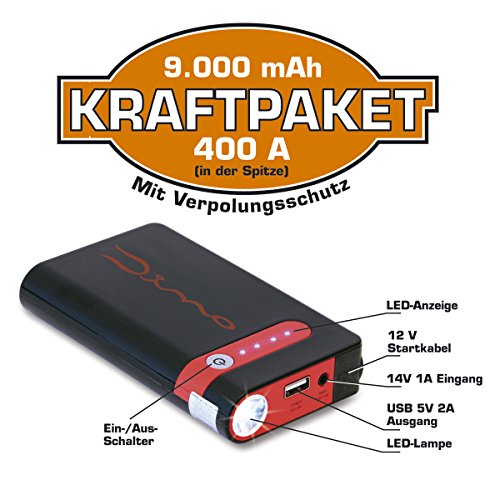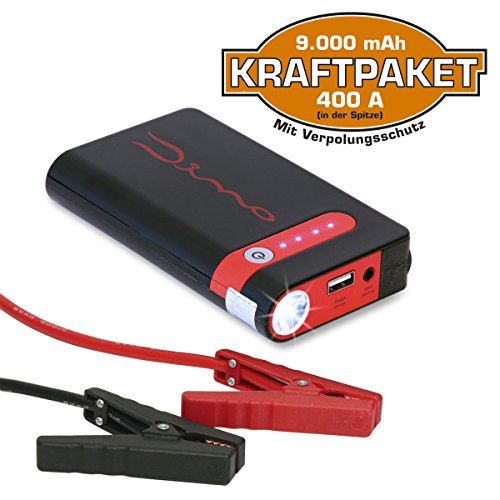 Dino KRAFTPAKET 12V-400A Starthilfgerät 33.3Wh 9000mAh mit Powerbank Starthilfe Booster Schnellstartsystem Starthilfekabel LED-Taschenlampe Ersatzakku USB Ladegerät für Smartphone Handy Tablet Micro USB Lightning Tablet-Stecker.