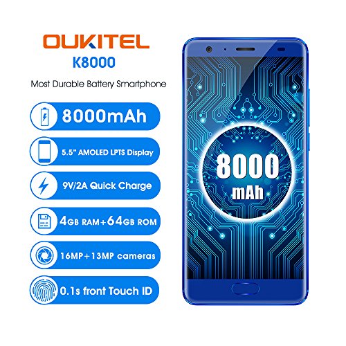 - OUKITEL K8000 Mit 8000mAh super große Batteriekapazität, liefert genug Energie für Sie, keine Sorge mehr über die Leistung. Unterstützt OTG Funktion für Reverse Charge Multi-Geräte und packt ein 5V / 2A Schnellladegerät für schnelleres Aufladen.