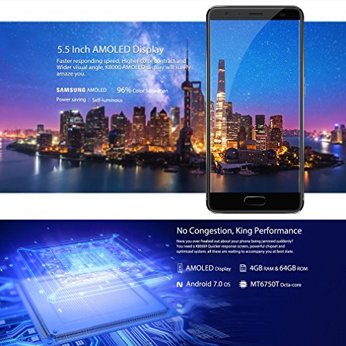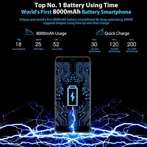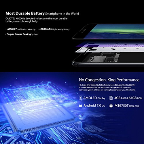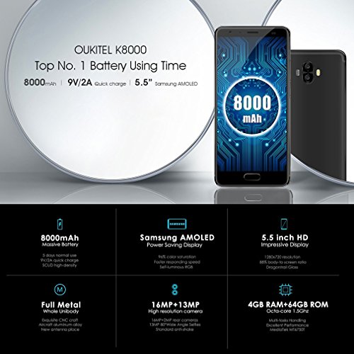 4G Smartphone Android 7.0, OUKITEL K8000 Handy Ohne Vertrag 5.5Zoll HD 1280*720 Pixel 4GB RAM+64GB ROM 8000mAh Akku 8.0MP Frontkamera+(13.0MP + 2.0MP)Dual Hauptkamera Fingerabdruck 12V/2A Flash Charge 1.5GHz, Octa-Kern Dual-SIM. Grundinformation